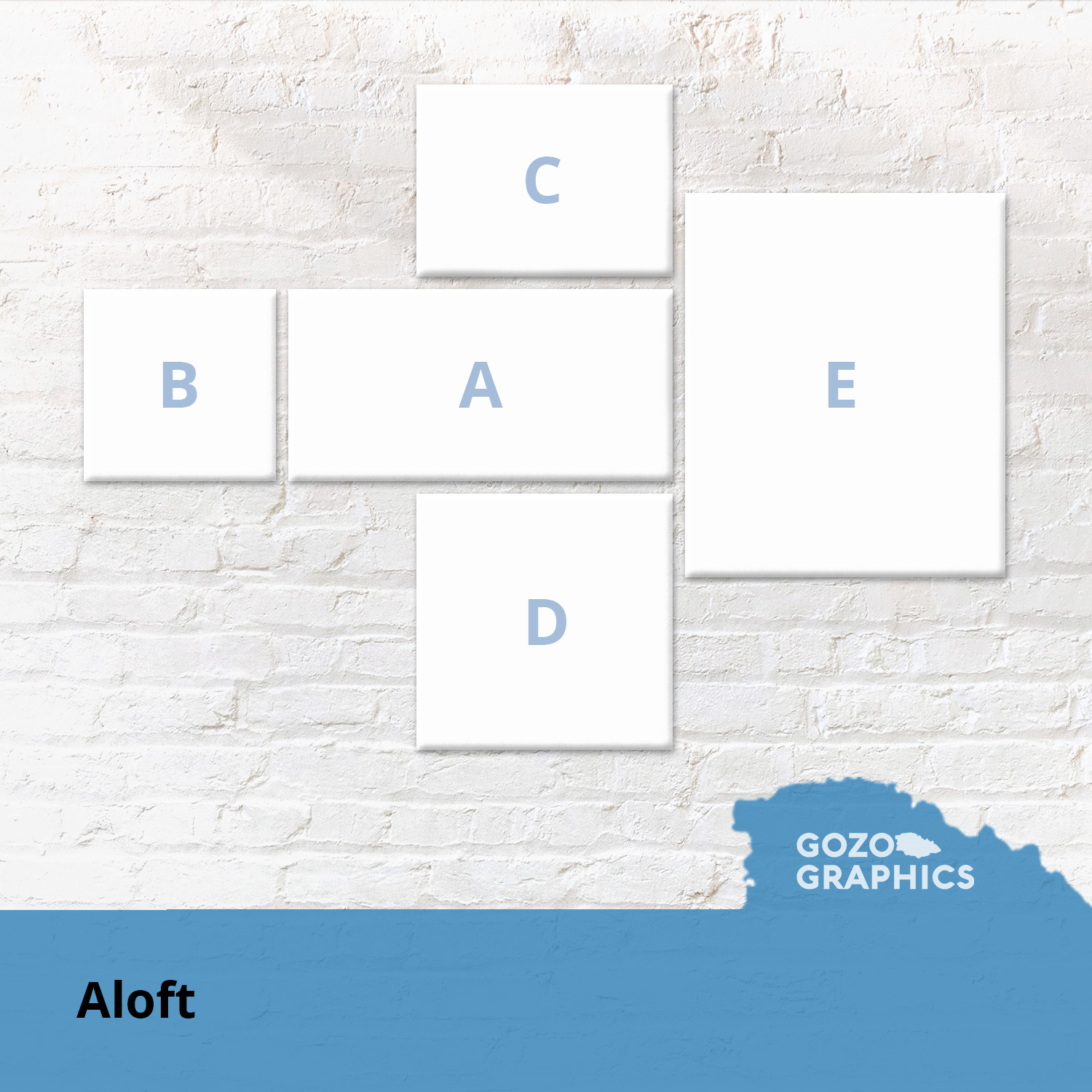Aloft composition consisting of 5 pieces. All prices are printed in HP Latex Inks, stretched on a 2cm deep wooden frame and can be purchased with or without lamination. Just insert your image and we’ll do the rest.