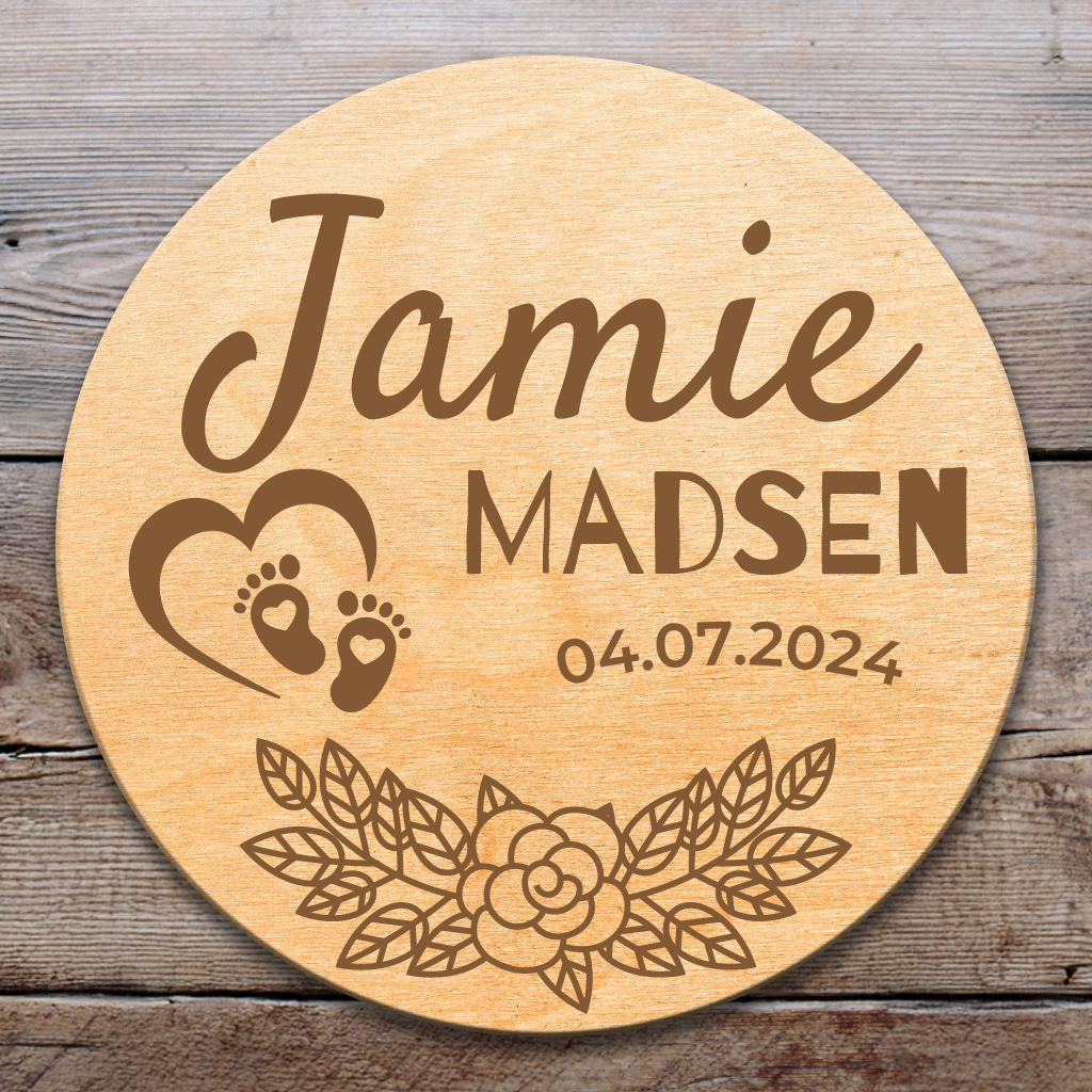 Expertly laser-engraved on durable 3.5mm thick bass/birch wood, this 9cm diameter piece is perfect for a nursery, as a heartfelt baby shower gift, or as a treasured keepsake for parents.