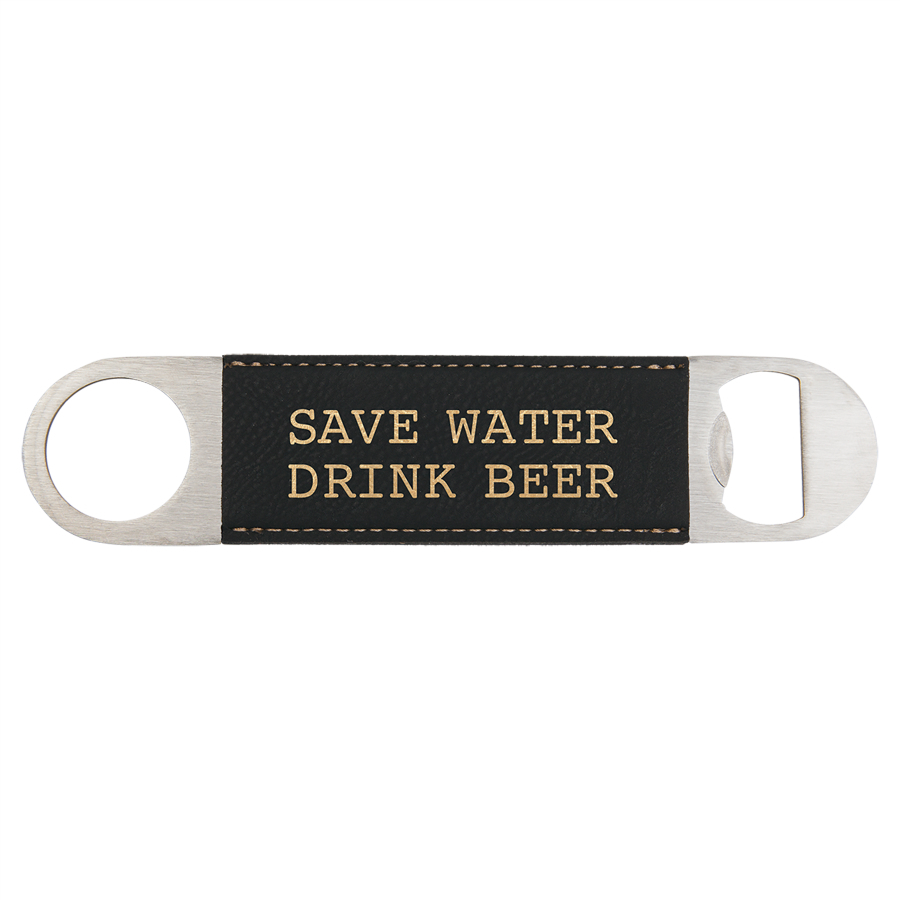 Stainless steel bottle opener – 38x178mm in PU leather, laser engravable. Laser engravable area 25x40mm. Upload your drawing or vector (supported file types SVG, AI, PDF) and well get it done. Engraving cost included in the price.
