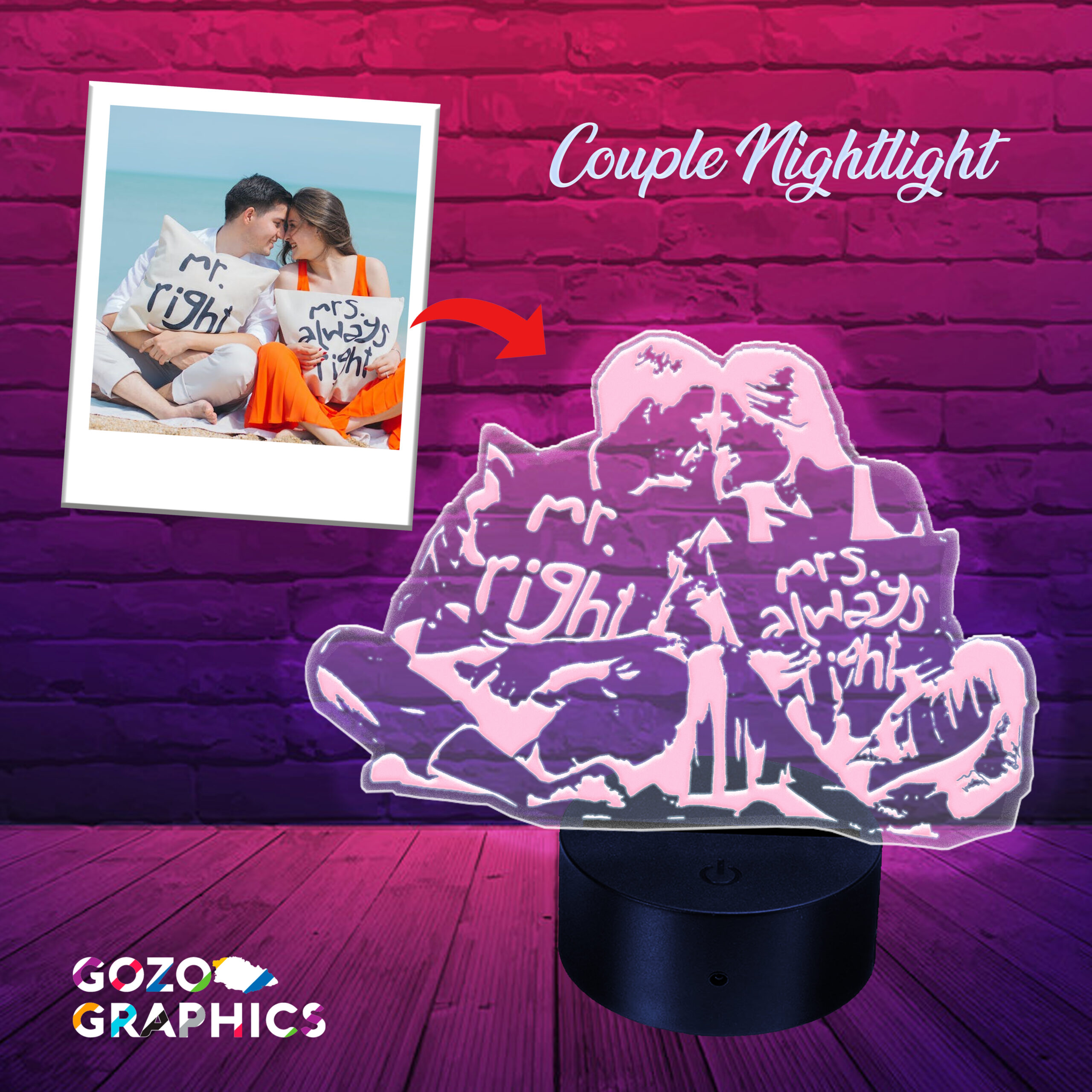 Surprise your partner or celebrate your love with this couple nightlight. With multicolour LED lights, remote control, USB and battery powered base, you can configure it in any way you like. The photo is engraved in a 3mm clear acrylic sheet (size up to 15x15cm) and illuminates when turned on. Send us your phot and we’ll do the rest! You will receive a preview of the artwork prior to us processing it. You can even add your own custom text to it.