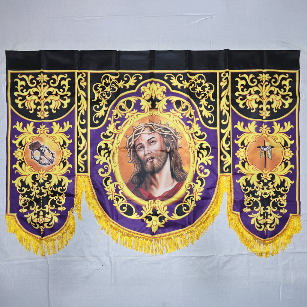 Enhance your home’s charm with our stunning balcony banners! Crafted from lightweight, weather-resistant material, these banners feature a majestic image of the Crowned Jesus Christ at the center, surrounded by intricate designs. Perfectly designed for any season, they bring a sense of reverence and spiritual significance to your home décor.