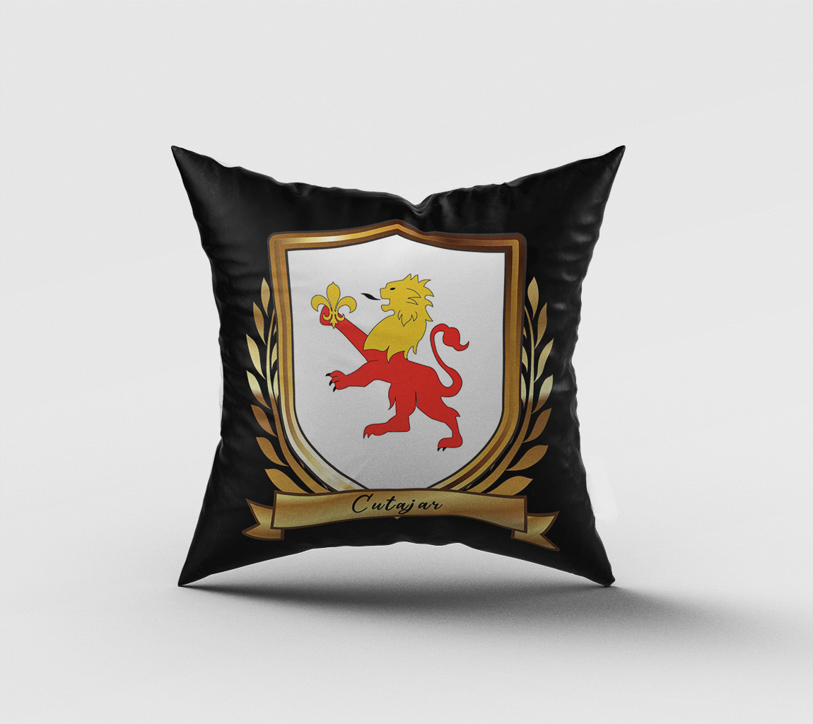 A custom-made cushion -available in 40x40cm cushsion, with or without filling, in edge-to-edge printed polyester and with Velcro closing mechanism. These cushions are ideal for indoor decoration. Available for all surnames (if you don’t find your surname we will gladly design a cushion with your surname shield at no additional cost). All cushionss are custom made and manufactured in monthly batches, therefore lead times may vary from 2-5 weeks.