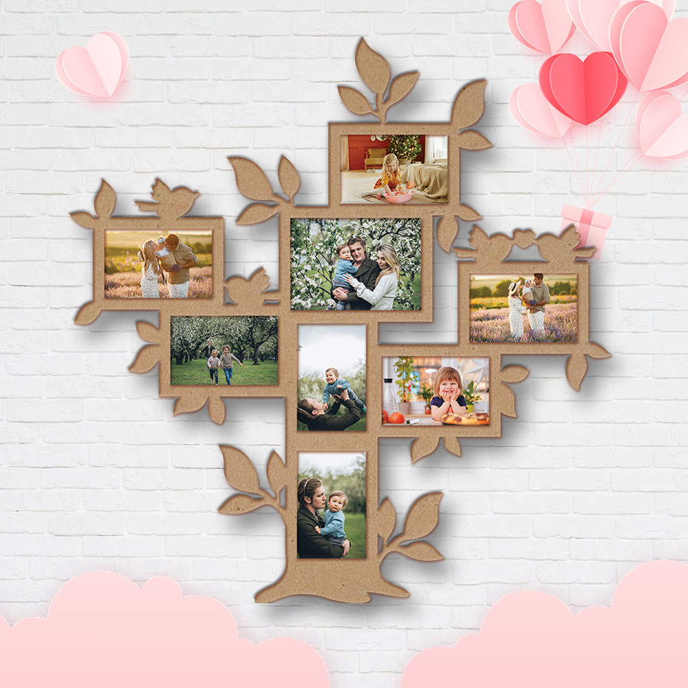 Custom printed Family Tree wooden frame, measuring 47x45cm, and made out of 4mm MDF. Upload the photos below according to the positioning you want them printed.
