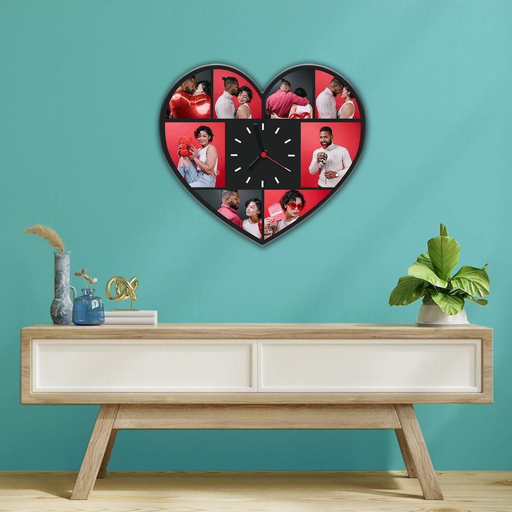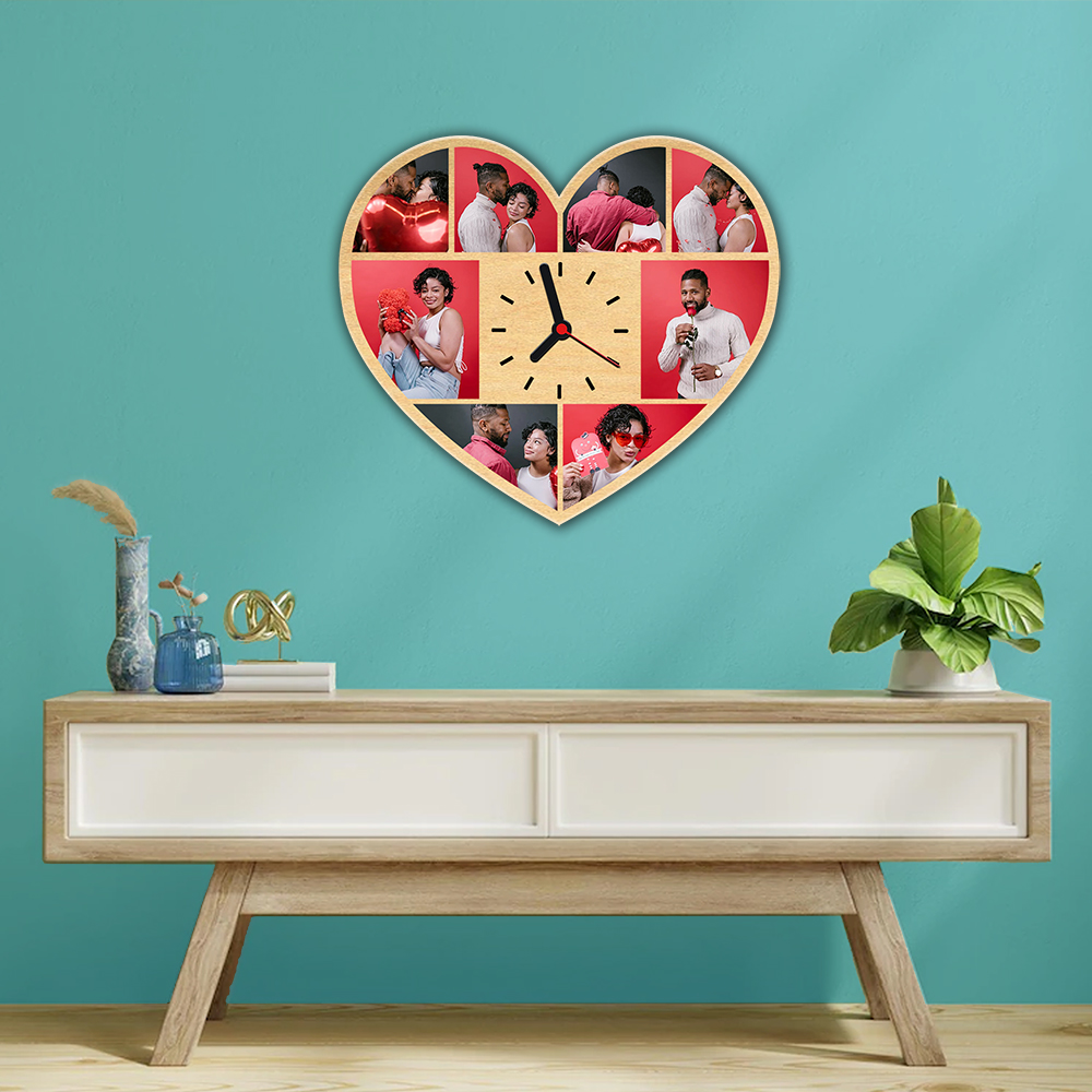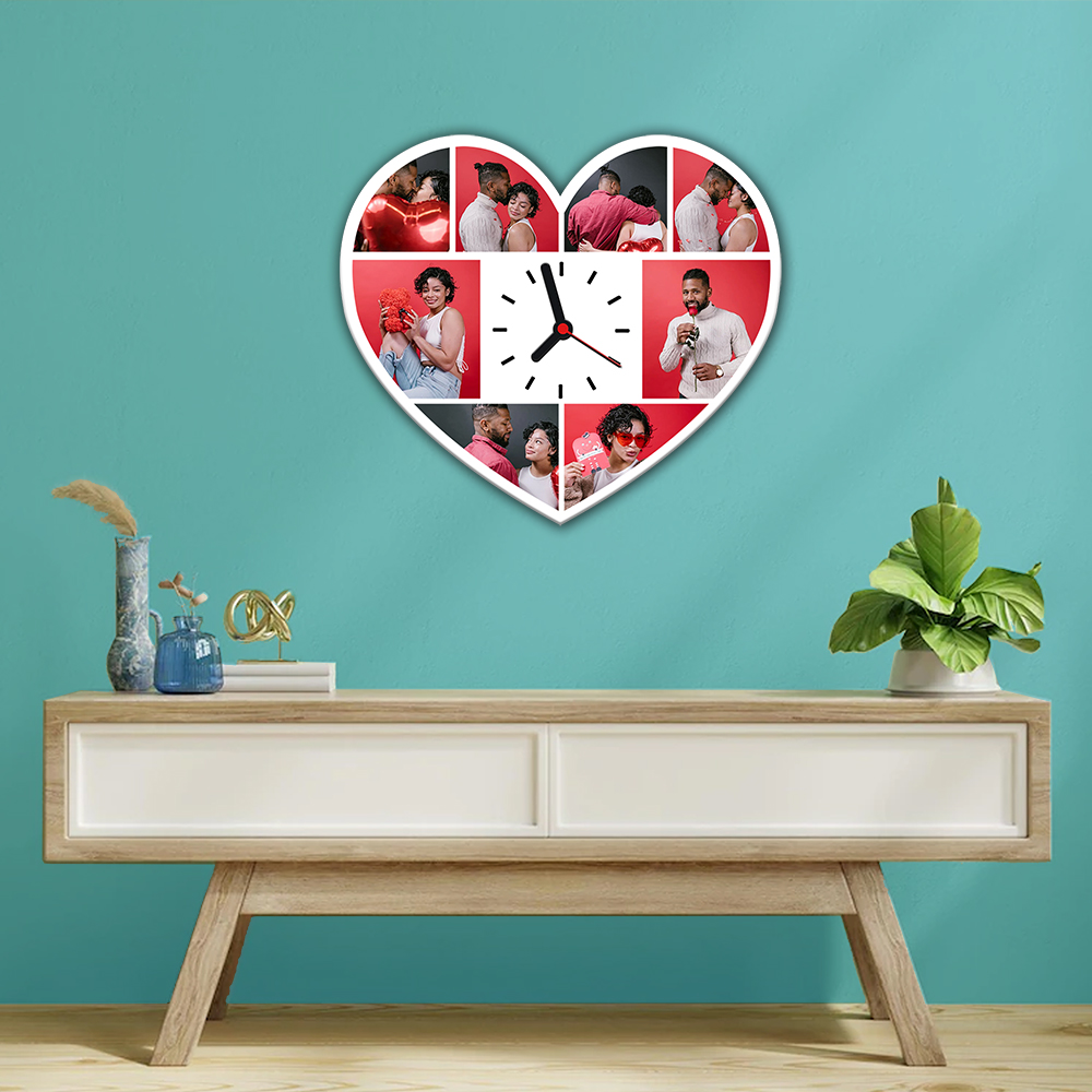 Introducing our unique and customizable Heart Collage – Wall photo clock a stunning addition to any home or office. Made of durable 4mm birch, You can choose between 28cm , 40cm and 50cm clock measures , and is powered by a high-quality quartz mechanism. The clock face is customizable, allowing you to design and personalize it to match your decor or to make it a special gift. The clock is easy to use and batteries are not included.