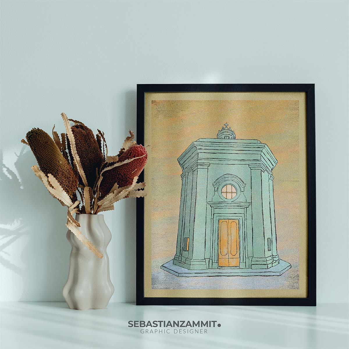 An original artist reproduction of iconic Maltese churches, chapels and buildings – created by the young talented artist – Sebastian Zammit. Available in canvas prints, photo print on Hahnemuhle Photo Lustre Photo Paper 260gsm and Framed Photo prints (on Hahnemühle Photo Lustre 260gsm, framed with a thin white wooden frame and matte glass). Prints are a limited edition of 100 units each, and each print shows the serial number on the back. All prints available in A4 (29.7x21cm), A3 (42×29.7cm), A2 (59.4x42cm) and A1 (84×59.4cm).